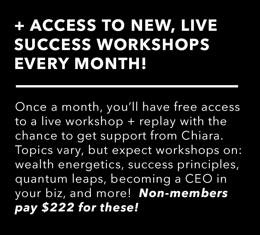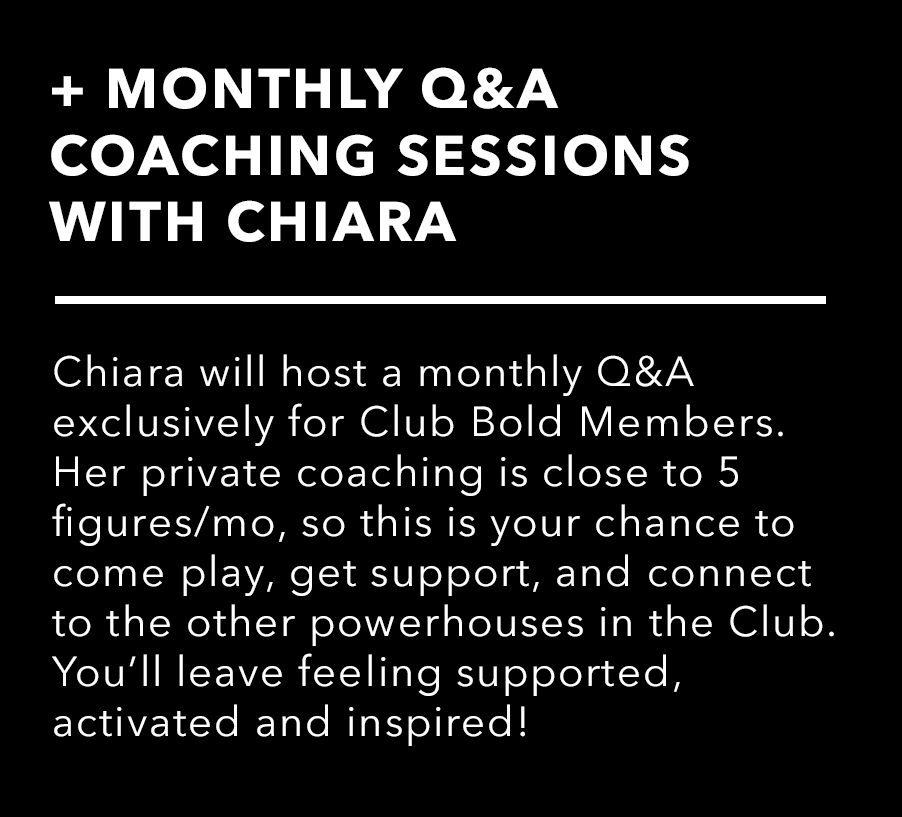 This is essentially a School for Success - but, honoring Chiara's beliefs around success being a multi dimensional concept. The Bold Self woman is defined as: Radiant (self-care), Ambitious (mindset), Tapped in (spirituality), Successful (wealth + business), and Free (lifestyle + soul). We need all of it to make our joyous pursuit to the life of our dreams!